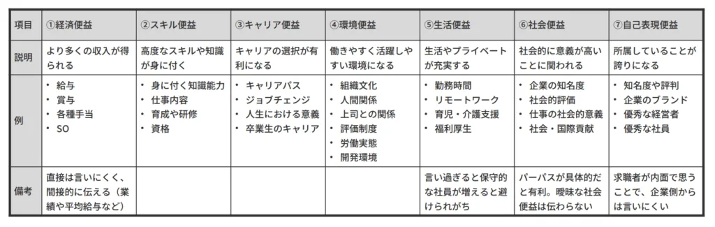見た目や雰囲気だけでは、「この会社で自分がどんなメリットを得られるのか」が求職者には伝わりません。それでは、応募にすら結びつきにくいのです。例えば、「入社便益」とは、以下のようなものです。