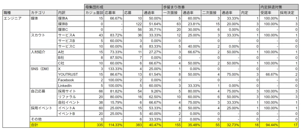 具体的には、例えば以下のような採用KPIシートを事前に用意しておくことで、職種やチャネルごとの数字の推移を整理できます。これにより、定量的なデータに基づいて、次の改善策に取り組むことが可能になります。