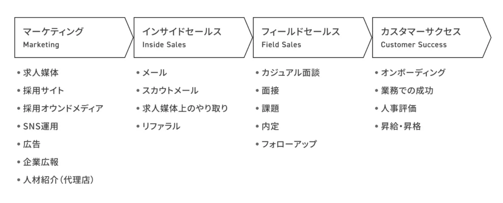 このThe Modelの構造は採用における人材獲得プロセスとほぼ同じ構造となっており、採用活動の役割分担の見直しや組織化にも応用できます。例えば、The Modelに合わせて採用活動を以下のように分解し、それぞれの担当者とKPIを設定することで、効率の良い採用組織を設計することができます。