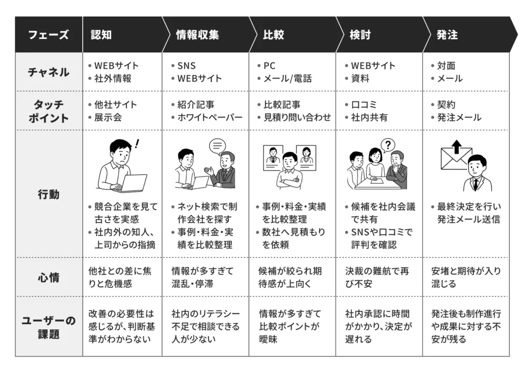 ただ、人の行動や心理の変化を時間軸で捉えるという考え方は、マーケティングにおいて普遍的に必要な見方であり、カスタマージャーニーマップ的に状況を分析する思考は、マーケターであれば頭の中に持っておくべきでしょう。