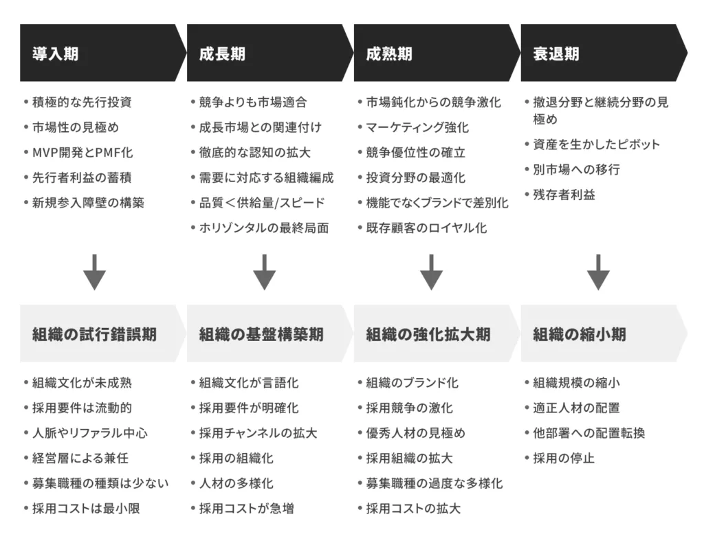 プロダクトライフサイクルを応用すると、事業フェーズと採用のあり方は、以下のように整理することができます。
