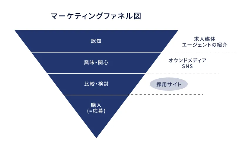 採用活動の流れをマーケティングの考え方である「マーケティングファネル」に当てはめてみると、採用サイトの位置付けが明確になります。マーケティングファネルとは、「認知→興味・関心→比較・検討→購入(採用においては応募)」という、消費者(=求職者)の意思決定プロセスを段階的に表したものです。