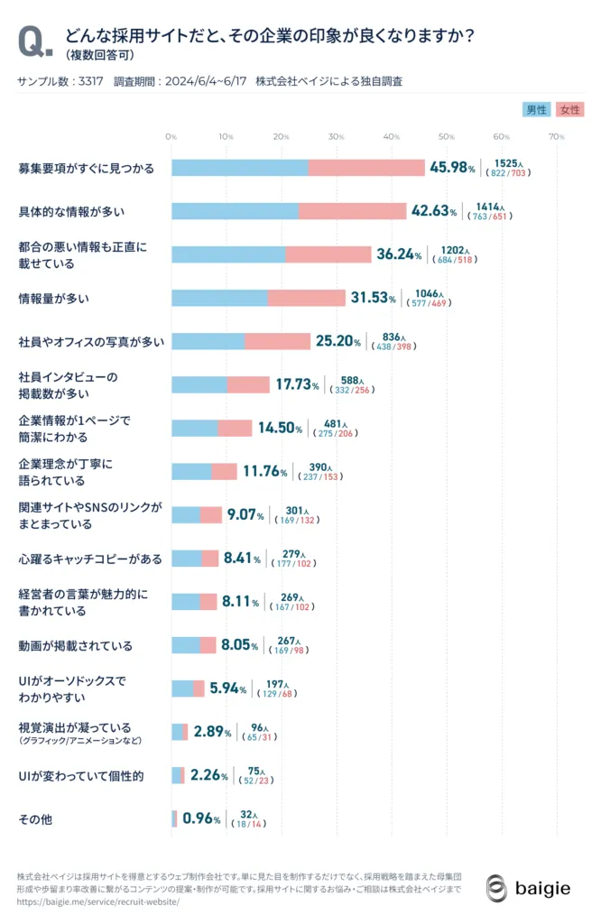 弊社が過去に実施した転職者に向けて行った採用サイトに関する調査でも、「どのような採用サイトであれば企業の印象が良いか」の質問において、「都合の悪い情報も正直に載せている」が3位にランクインしています。