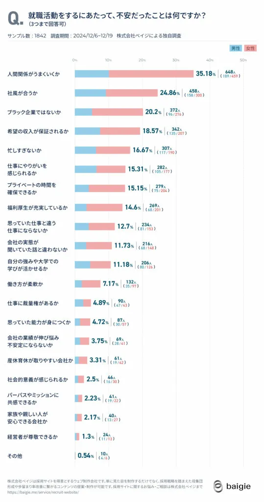 なお、弊社の実施した新卒採用に関する調査においても、就職に抱える不安について聞いたところ、人間関係や就労条件に関するものが上位を占め、企業側が積極的に伝えがちなパーパスやミッションは優先度が高くないことが分かりました。