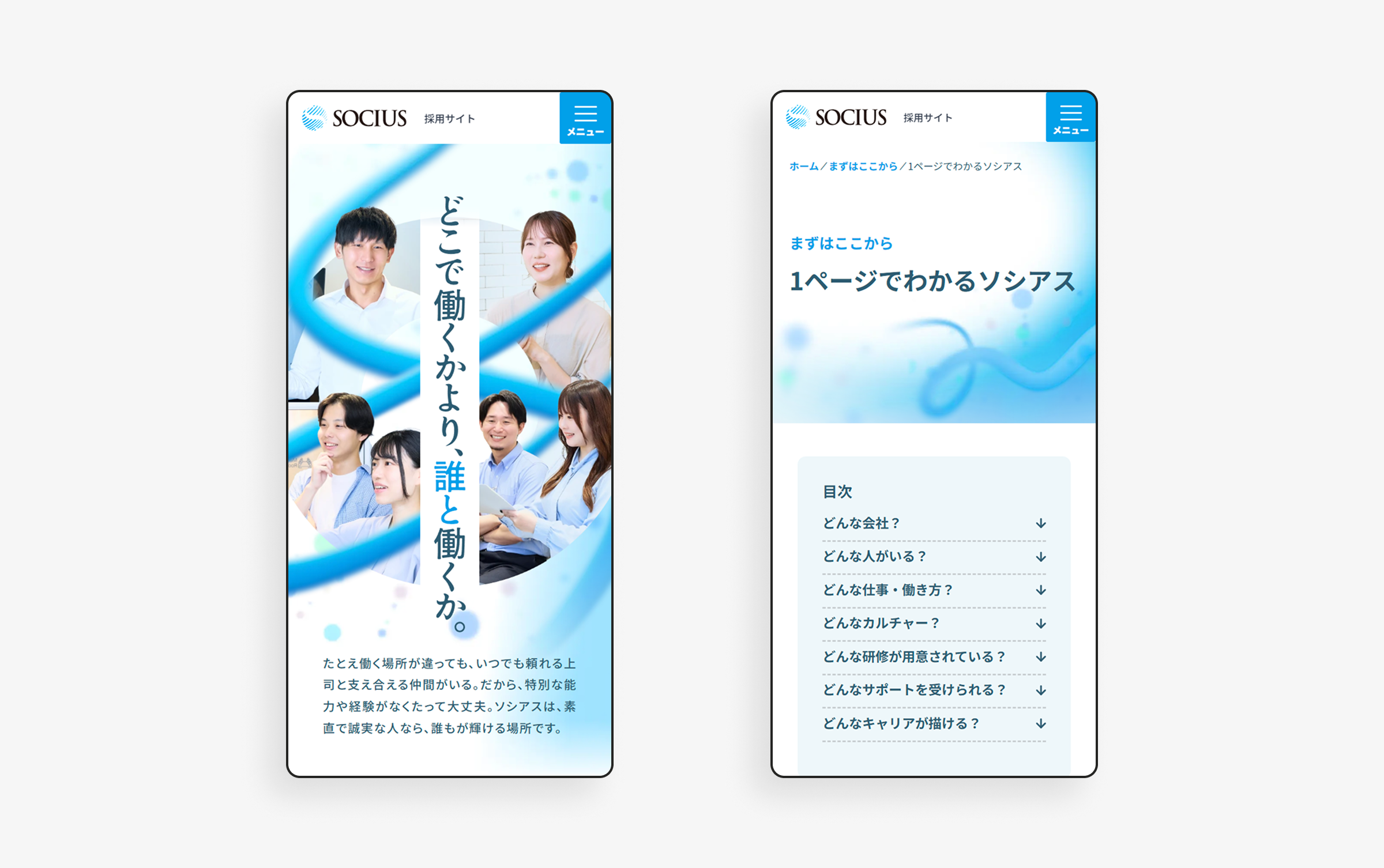 インフラエンジニアを中心としたSES事業を展開するソシアス様の採用サイトリニューアルを担当しました。リファラル採用を軸に組織を拡大してきた同社ですが、さらなる成長に向けて求人媒体やエージェントなど採用チャネルを拡大。しかし、これらのチャネルだけでは企業理解が十分に進まず、応募時の不安解消や入社後のギャップ軽減が課題となっていました。
